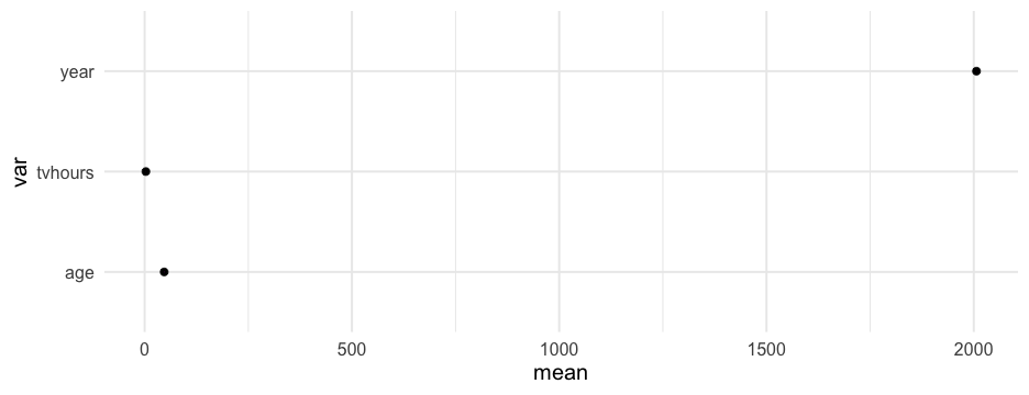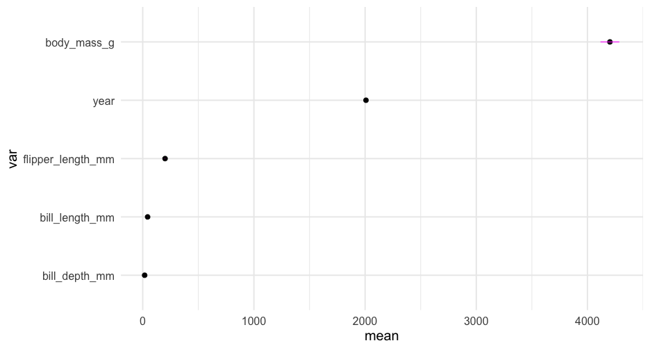 ## # A tibble: 3 × 3## var mean se## <chr> <dbl> <dbl>## 1 age 47.18008 0.1181556 ## 2 tvhours 2.980771 0.02429812## 3 year 2006.502 0.03037436plot_means <- function(df) { means <- estimate_means(df) %>% mutate(var = reorder(factor(var), mean)) ggplot(means, aes(mean, var)) + geom_point() + geom_linerange( aes(xmin = mean + (qnorm(0.025) * se), xmax = mean + (qnorm(0.975) * se)), color = "magenta", )}