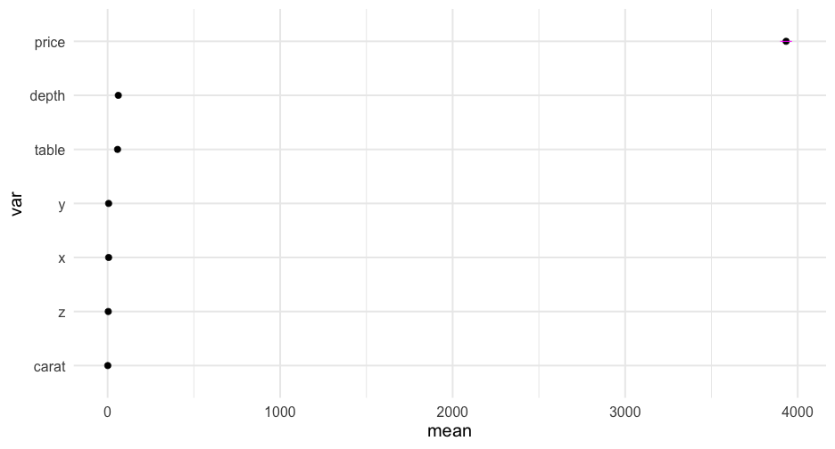 ## # A tibble: 3 × 5## var mean sd min max## <chr> <dbl> <dbl> <dbl> <dbl>## 1 depth 61.74940 1.432621 43 79## 2 price 3932.800 3989.440 326 18823## 3 table 57.45718 2.234491 43 9507:00