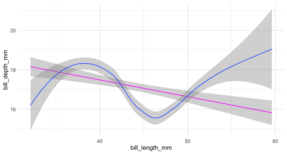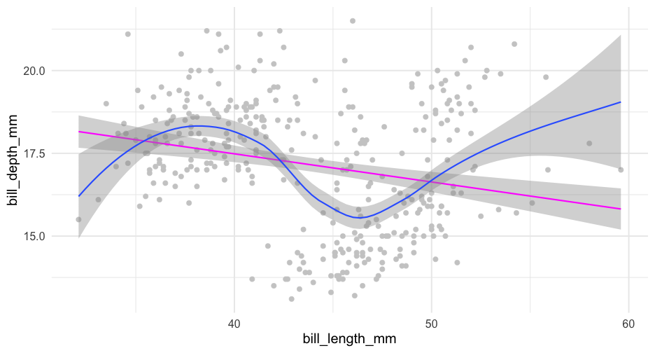 ## # A tibble: 5 × 5## var mean sd## <chr> <dbl> <dbl>## 1 bill_depth_mm 17.15117 1.974793 ## 2 bill_length_mm 43.92193 5.459584 ## 3 body_mass_g 4201.754 801.9545 ## 4 flipper_length_mm 200.9152 14.06171 ## 5 year 2008.029 0.8183559## # … with 2 more variables: min <dbl>,## # max <dbl>check_linear <- function(data, x, y, se = TRUE, points = FALSE) { p <- ggplot(data, aes(x, y)) if(isTRUE(points)) { p <- p + geom_point(color = "gray80") } if(isTRUE(se)) { p <- p + geom_smooth(method = "lm") + geom_smooth() } else { p <- p + geom_smooth(method = "lm", se = FALSE) + geom_smooth(se = FALSE) } p}Note - there are other approaches too, but they are soft deprecated